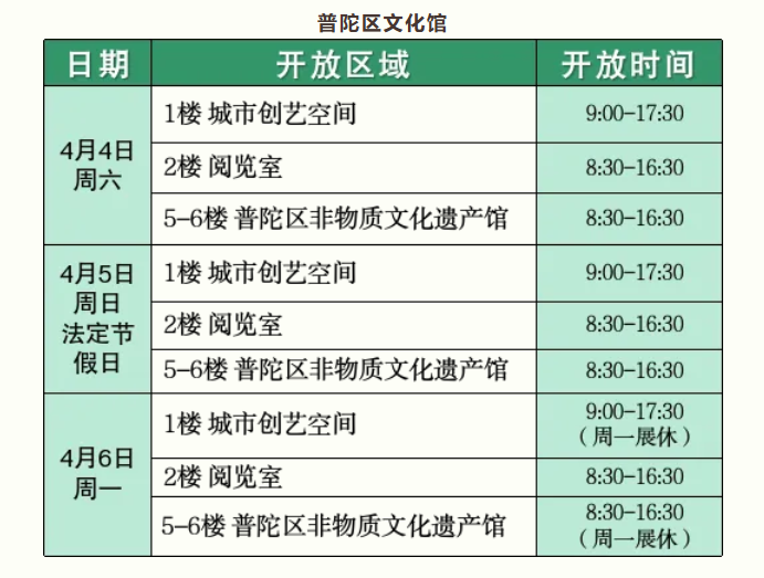 尊敬的市民游客朋友,普陀区公共文化场馆2026年清明假期开放时间如下,快收藏吧~